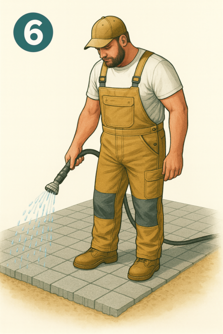 TERRABOND wird einfach anstatt Sand trocken in die Fugen eingekehrt und verdichtet.  Mit Wasser aktiviert bindet das Polymer-Fugenmaterial zu einer festen widerstandsfähigen Fuge ab.